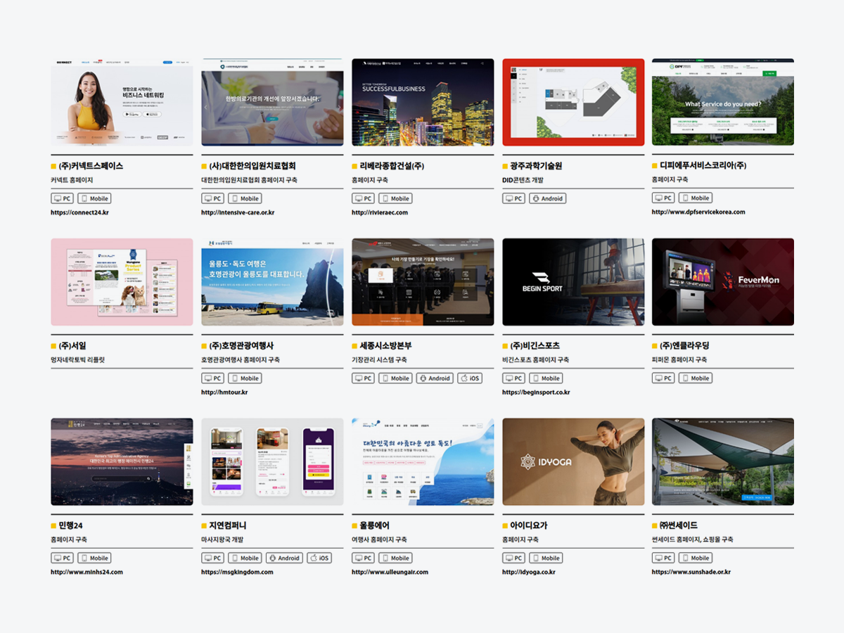 홈페이지, 쇼핑몰, 모바일 웹, 하이브리드 앱, 기업 포털 등